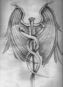 This is one of her two final drawings. The idea was the medical symbol (aka the caduceus), a familiar logo. But I wanted to display a sense of loss and disappointment; the snakes were to be uneven and a little fierce, the wings drooping as if they can't quite fly. |